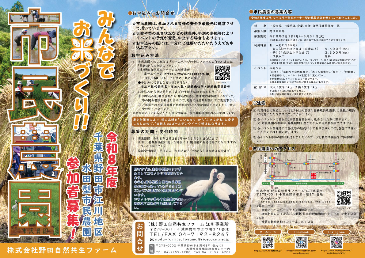株式会社野田自然共生ファームは、千葉県野田市で「農業と自然の共生した地域づくり」